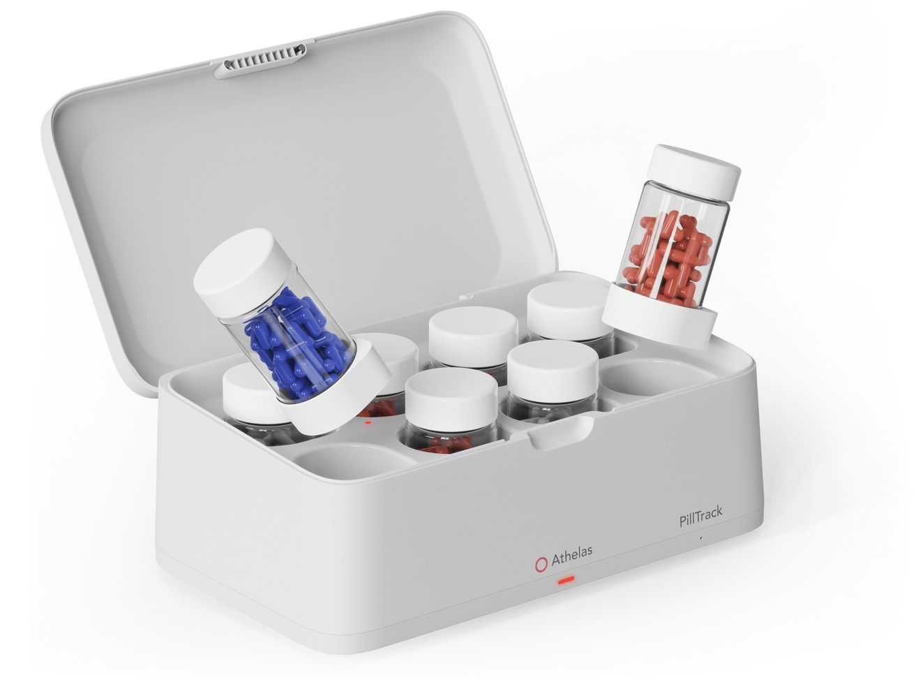 The device has an LED indicator for each pill bottle, working between red and blue, showing which medication has been taken (blue) or not (red).
